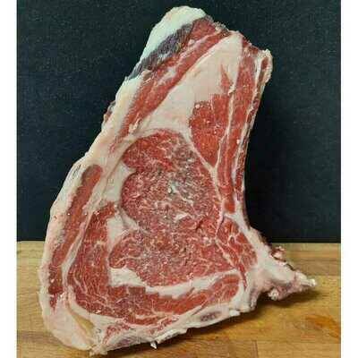 Super marmoriertes, 4 Wochen am Knochen gereiftes Steak, 4cm stark für Feinschmecker und Grillprofis. Von der Färse (weibliches Jungrind).